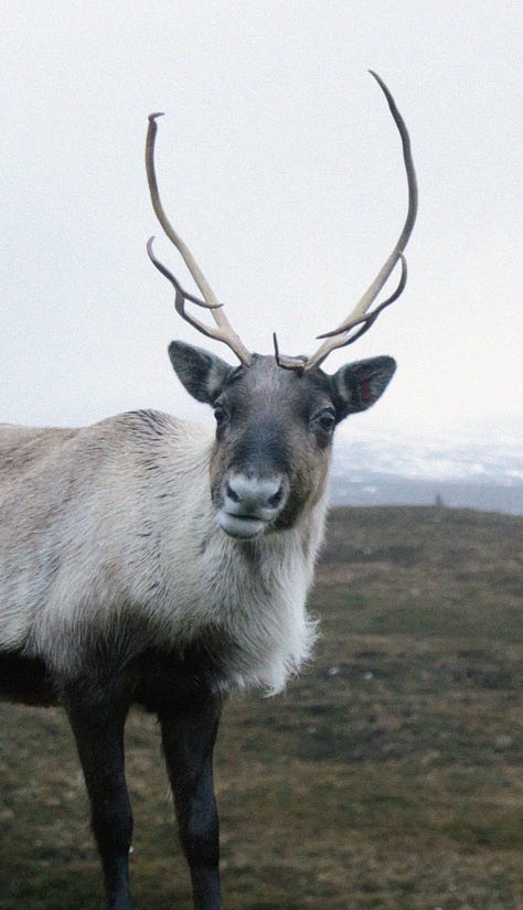 We couldn’t resist snapping a few pictures - and stayed for an hour in the gentle presence of these winter beasts until our hands were red and frozen. I didn’t want to leave, and wondered if I could just stay forever in this magical bubble - with only the reindeers for company. Eventually the reindeers themselves wandered right into the car park where our car was, as if to say; alright you strange creatures, that’s enough now. Get back into your metal box and warm up. You have no fur like ours to insulate your skin from this cold.